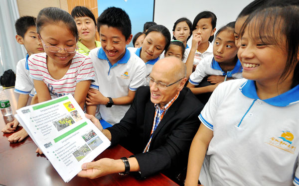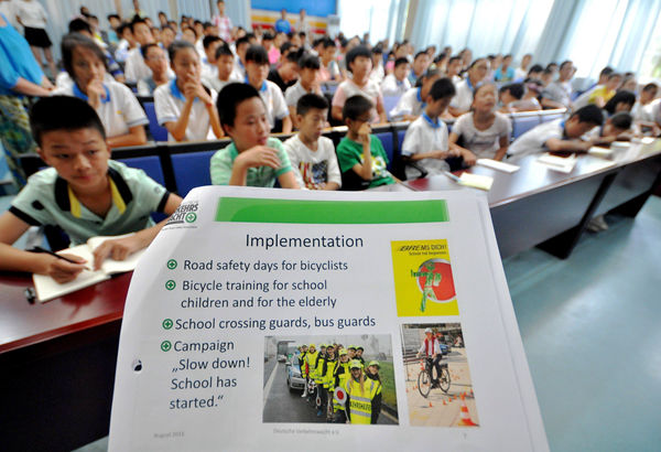 博德維希教授與在場(chǎng)的七年級(jí)學(xué)生進(jìn)行提問(wèn)互動(dòng)。同學(xué)們提出了諸如“中學(xué)生如何安全到學(xué)校”“無(wú)牌照摩托車是否可以上路”“沒(méi)有自行車道自行車該往那行駛”等問(wèn)題,教授以幽默風(fēng)趣的語(yǔ)氣耐心解答了每個(gè)提問(wèn)他告訴大家,中學(xué)生騎自行車上學(xué)時(shí),要注意紅綠燈的轉(zhuǎn)換,看清“紅燈停,綠燈行”的規(guī)則。每個(gè)人都應(yīng)該知道保護(hù)自己,坐公交車要小心,別使勁擠,記得“等一等”。講座后,他還為十多位對(duì)交通安全知識(shí)感興趣的同學(xué)詳細(xì)講述了德國(guó)針對(duì)學(xué)生群體的交通措施,如對(duì)學(xué)生進(jìn)行安全測(cè)試,檢查是否遵守交通規(guī)則;為了保護(hù)學(xué)生騎自行車安全抵達(dá)學(xué)校,學(xué)生在上學(xué)期間會(huì)統(tǒng)一穿上一種黃色制服等。