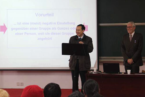奚韋德教授從西方視角解析文化的內(nèi)涵,并對(duì)比中國(guó)視角下的文化內(nèi)涵,通過(guò)對(duì)文化進(jìn)行深入分析,以中國(guó)、德國(guó)以及美國(guó)等為例,講述了不同文化的具體表現(xiàn)形式。他還談到中國(guó)逐漸成為德國(guó)的重要投資國(guó),這已成為一種發(fā)展趨勢(shì),并對(duì)比了不同國(guó)家在不同的時(shí)間、空間和環(huán)境下文化差異的具體體現(xiàn)。他還通過(guò)大量的圖片和數(shù)據(jù),生動(dòng)有趣地對(duì)中德合資企業(yè)的跨文化管理進(jìn)行了深入淺出的分析。奚韋德教授精彩的報(bào)告內(nèi)容,風(fēng)趣幽默、深入淺出的演講風(fēng)格使得報(bào)告現(xiàn)場(chǎng)氣氛輕松活躍,他還與師生進(jìn)行了互動(dòng)和溝通。(宣傳部 國(guó)際交流合作處)