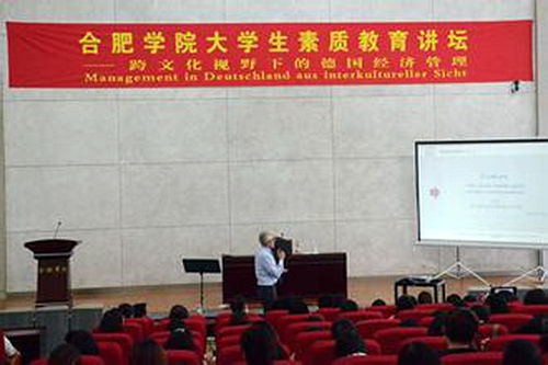 奚偉德教授是一位學(xué)者型的企業(yè)家。在繁忙的工作之余,他從來(lái)沒(méi)有忘記過(guò)他在合肥學(xué)院的教育事業(yè)。2015年6月,已成為德國(guó)奧斯納布呂克大學(xué)經(jīng)濟(jì)學(xué)系博士生導(dǎo)師的他又一次來(lái)到合肥學(xué)院,做客大學(xué)生素質(zhì)教育講壇,開(kāi)展了題為《從跨文化視野看德國(guó)經(jīng)濟(jì)管理》專(zhuān)題報(bào)告。