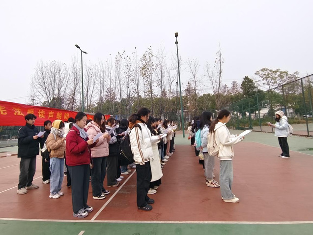 12月13日清晨,參加活動的學生以飽滿的精神狀態在一期校園體育場集合。活動伊始,全體學生排好隊形,整齊肅立。隨后,在領讀同學的帶領下,一起朗讀《憲法》的節選內容。天氣雖然寒冷,但我院學子神情專注而又莊重,朗讀聲清晰而又堅定。在每一聲鏗鏘有力的聲音中,學生們用昂揚向上的熱情驅散了寒意,用奮進拼搏的姿態推動了憲法晨讀活動走向高潮。
