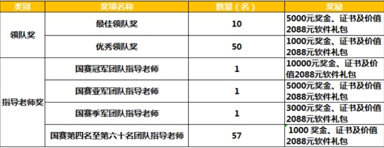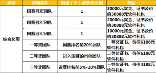 所有報名參加校賽的學生可獲得價值2088元的經(jīng)典軟件禮包一份。成功晉級省賽的學生可獲得價值4188元的豪華軟件禮包。成功晉級國賽的學生可獲得價值6188元的尊貴軟件禮包一份。