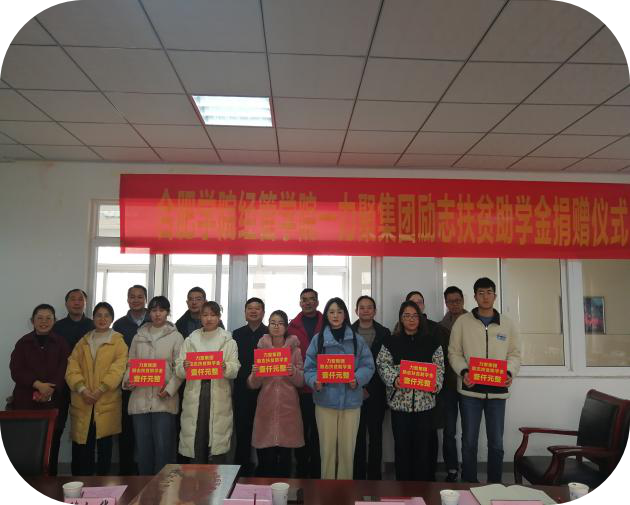 會議伊始,陳江華院長首先向來訪企業方人員表示熱烈歡迎,介紹經管學院總體情況和發展前景,高度贊揚力聚集團對我院貧困學子的捐助行為。陳邦勤書記向與會成員介紹了力聚集團的發展歷程,表明了此次捐助的目的,期待雙方在人才培養等多方面進一步展開合作。接著,劉金平主任介紹了合肥學院中德合作基金會的發展歷程以及所取得的成就,姚國強總監詳細說明了此次捐助的來龍去脈,表達了希望雙方共同進步的愿景,表示隨時歡迎我校學生加入力聚集團。受助學生代表對力聚集團的捐贈及合肥學院的培養表達了真摯的感謝,表示一定不辜負校企雙方的希冀,圓滿完成自己的學業。最后,校企雙方簽訂實習基地協議及捐贈協議;校方代表楊學春、劉金平、張永軍與企業代表陳邦勤、姚國強、周龍海一道為受助的六位同學頒發助學金,然后校企雙方進行了合影留念。