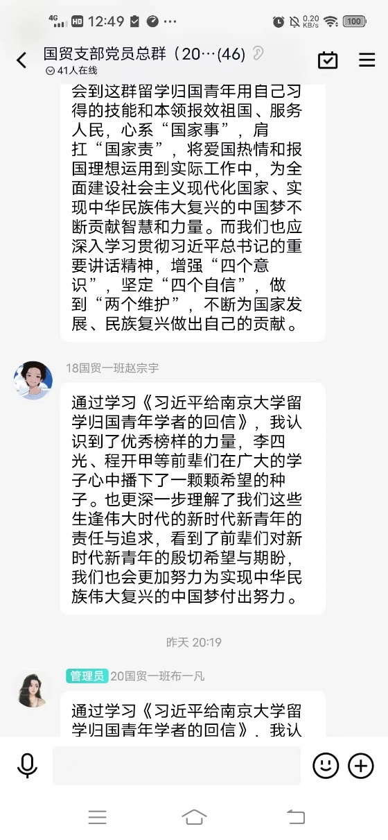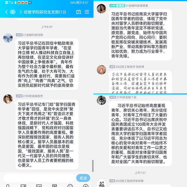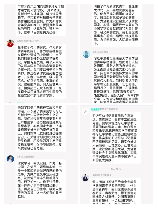 經濟與管理學院黨委要求師生黨員深入學習領會《習近平給南京大學留學歸國青年學者的回信》中的重要論述內涵。習近平總書記指出,青年學者應該大力弘揚留學報國的光榮傳統,以報效國家、服務人民為自覺追求,在堅持立德樹人、推動科技自立自強上再創佳績,在堅定文化自信、講好中國故事上爭做表率。各教職工黨支部、學生黨支部和研究生黨支部均深入學習了《習近平給南京大學留學歸國青年學者的回信》內容和精神,結合工作實際,紛紛就學習內容做線上交流發言,表示青年生逢偉大時代,當時刻謹記習近平總書記殷殷囑托、切切寄語,起而行之、勇挑重擔,在現代化建設新征程上唱響“青春贊歌”。