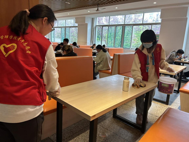 為營造食堂文明舒適的就餐環境倡導節約用餐的優良行為,2024年4月2日,經濟與管理學院青年志愿者們前往一期食堂展開志愿服務活動。