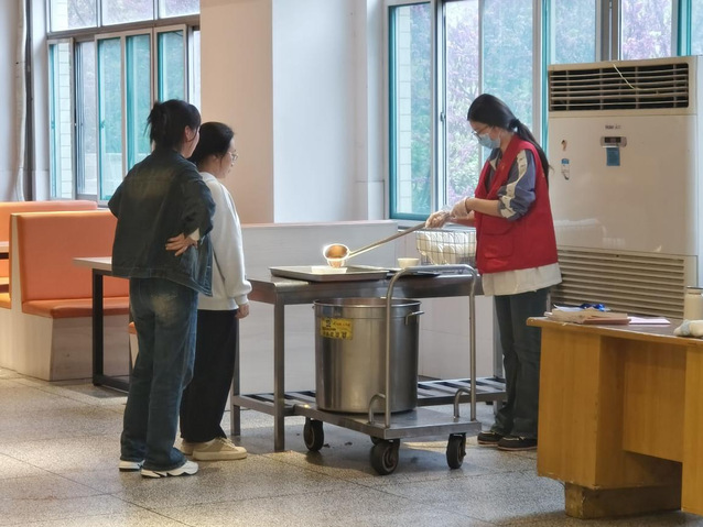 活動當,青年志愿者們準時來到食堂開展工作。志愿者們分工進行了打湯、清理餐桌回收餐盤等工作,協助食堂阿姨用小推車將餐盤送至后廚。志愿活動有序地進行,就餐師生志愿者們的服務表示贊賞。