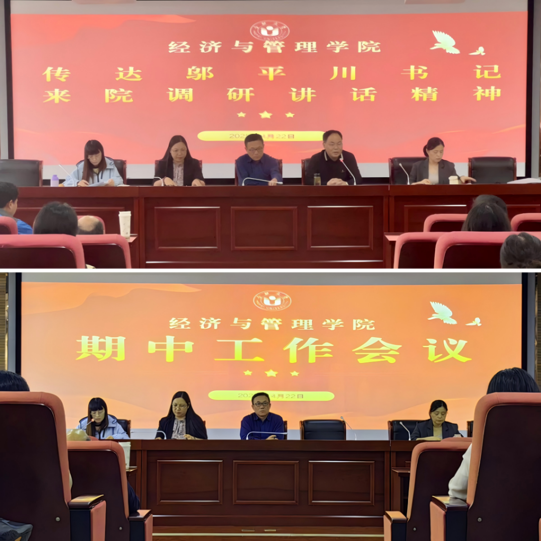 4月22日?,經濟與管理學院在一期報告廳召開期中工作會議,學院領導班子成員及全體教職工參會。會議圍繞校黨委書記鄔平川調研講話精神傳達、期中工作部署、就業進展通報、科研與學科建設推進等核心議題展開,為學院下一階段工作指明方向。? 會議伊始,倪澤強?和陳江華?傳達了鄔書記近期來院調研的講話精神。鄔書記指出要持續深化新文科建設,推動產學研合作,更好地服務地方經濟社會發展。倪澤強強調全體教職工要以調研精神為指引,促進黨的建設和業務發展“一融雙高”。陳江華結合學院實際提出,要聚焦立德樹人根本任務,強化責任擔當,確保年度重點任務高質量完成。?