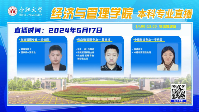 2024年6月17日,合肥大學(xué)經(jīng)濟(jì)與管理學(xué)院各專業(yè)負(fù)責(zé)人走進(jìn)直播間,通過(guò)在線直播的形式,連接學(xué)生與高校,讓未來(lái)的大學(xué)生們?cè)谄聊磺熬湍軌蛏钊肓私馕以旱谋究茖I(yè)設(shè)置、課程內(nèi)容、師資力量、就業(yè)前景及校園生活等方方面面的信息。 本次直播涉及到物流管理系、經(jīng)濟(jì)貿(mào)易系、財(cái)務(wù)會(huì)計(jì)系以及投資金融系共10個(gè)普通本科專業(yè)和1個(gè)物流管理對(duì)外合作專業(yè)。各位專業(yè)負(fù)責(zé)人從專業(yè)培養(yǎng)目標(biāo)、專業(yè)特色以及就業(yè)前景等多個(gè)方面全面介紹了各個(gè)專業(yè)“是什么”、“學(xué)什么”以及“干什么”的問(wèn)題。