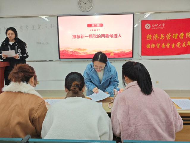 11月26日,經濟與管理學院國際貿易學生黨支部順利召開黨員大會。本次會議旨在傳達學習學校有關文件精神,并推薦學院新一屆黨的委員會和紀律檢查委員會委員候選人。 會議伊始,黨支部書記劉丹青領學習近平總書記關于巡視巡察工作的重要論述、《中國共產黨巡視工作條例》和《近三年黨中央、安徽省委巡視工作相關會議精神學習匯編》等文件精神,結合國際貿易學生黨支部的實際情況,對黨員們提出了具體的工作要求,切實把思想和行動統一到學校黨委的決策部署上來,充分發揮黨員的先鋒模范作用,為黨支部的建設和發展貢獻力量。 會議第二項,推薦學院新一屆“兩委”委員候選人。為確保推薦工作的公正、公平、公開,黨支部書記劉丹青詳細介紹了“兩委”委員必須具備的條件,并強調了推薦工作的重要性和意義。接著,全體正式黨員按照學校黨委有關文件精神的要求,結合候選人的政治素質、工作能力、群眾基礎等方面的表現,獨立填寫推薦票。 會議最后,黨支部書記劉丹青要求全體黨員繼續深入學習黨的理論和路線方針政策,不斷提高自身的政治素質和業務能力;要積極參與黨支部的各項工作和活動,為黨支部的建設和發展貢獻自己的力量;要時刻保持黨員的先進性和純潔性,樹立良好的黨員形象。 此次黨員大會的召開,不僅傳達學習了學校有關文件精神,也順利完成了新一屆“兩委”委員候選人的推薦工作,增強了支部的凝聚力和向心力。