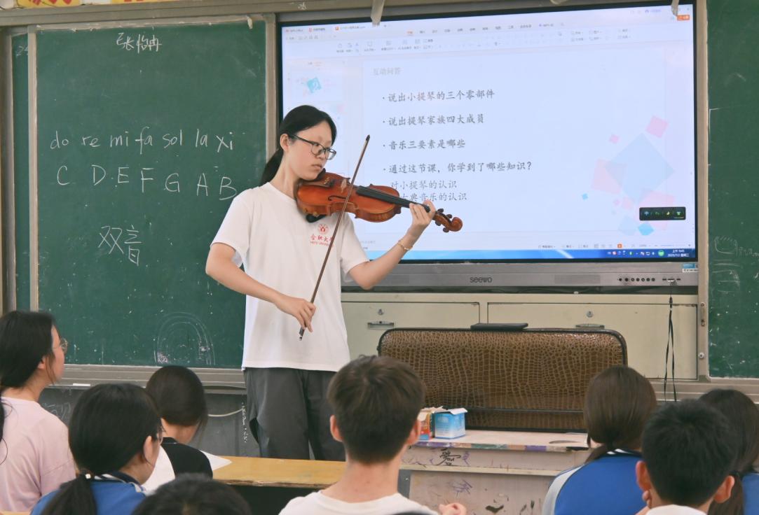 與此同時,“小提琴藝術鑒賞”課堂上,悠揚的琴聲回蕩。團隊成員從基礎樂理知識講起,通過示范演奏和趣味互動,讓學生們感受小提琴的魅力。學生們還參與了模仿演奏和音樂知識問答,課堂氛圍活躍。
