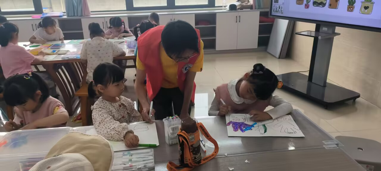 時間在悄然無聲中悄然流逝,轉瞬間,下課鈴聲響起。小朋友們卻依舊沉醉在創作的歡樂海洋里,他們的作品漸漸展現出獨一無二的個性與魅力。志愿者們目睹這一幅幅溫馨而又充滿奇思妙想的畫面,內心洋溢著滿滿的成就感與歡樂。