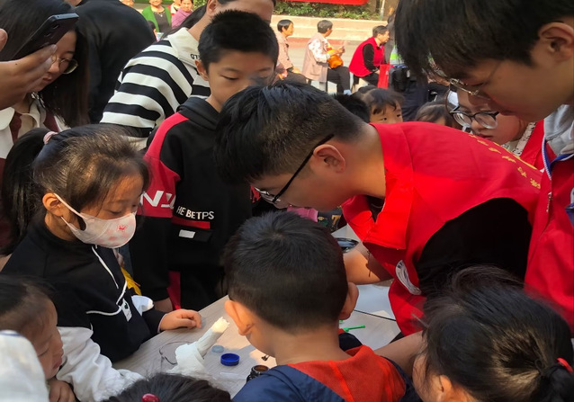 本次活動的首個環節是社區化學實驗。在本環節中,志愿者們通過從實驗室帶來的化學實驗裝置與試劑,向居民們簡單地展示了化學反應的基本原理和實驗過程,旨在讓大家在輕松愉快的氛圍中了解有關化學的知識。例如,團隊成員們使用靛藍二磺酸鈉、碘伏、維生素C等實驗試劑以及燒杯等裝置,為大家演示了變色碘伏實驗,配置碘酒溶液、著色、研磨維生素C并進行最終反應,實驗過程中不僅做到每一步都準確完成,更是在不停地講解每一步所發生的化學反應原理,為什么燒杯中的溶液顏色會不停地變換,用通俗易懂的語言生動形象地描繪了奇妙多彩的化學世界,通過精心設計的實驗項目,參與者將親身體驗化學反應的神奇魅力,增加了大家對科學的興趣和認識。居民們對此表現出濃厚的興趣,紛紛詢問和探究,志愿者們也一一解答,使得居民們對化學實驗有了更深入的了解。