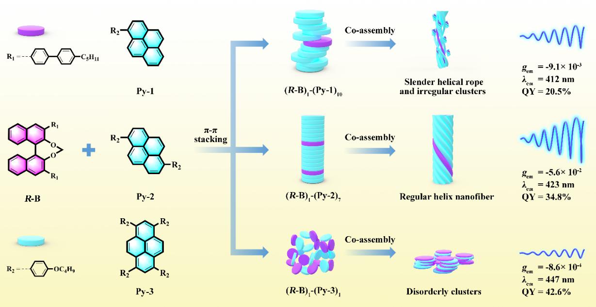 CPL材料的發光行為(例如,發射波長,量子產量以及glum值)調控對其實際應用具有重要意義。迄今為止,針對手性芘基自組裝或共組裝的CPL發射行為的調控策略主要集中于調節手性誘導劑結構、分子內或分子間相互作用、溶劑效應等因素,而在手性共組裝體系中,通過改變非手性芘基發射體的結構對稱性來調節CPL發射行為的報道還很少。研究人員精心設計了3種具有不同丁氧基苯取代基數目的非手性芘基有機小分子 (Py-1、Py-2和Py-3)和錨定二面角的手性二苯基誘導劑(R/S-B)構建手性共組裝體,并探討了它們誘導的CPL行為。研究發現,制備的手性共組裝體具有多層級CPL發射行為。結構分析和分子動力學模擬表明,(R/S-B)1-(Py-1)10、(R/S-B)1-(Py-2)7和(R/S-B)1-(Py-3)1的多層級CPL發射行為可歸因于非手性芘基發射體的結構對稱效應導致的不同共組裝模式。其中,(R/S-B)1-(Py-2)7的最強CPL發射(|gem| = 5.6×10-2,λem = 423 nm, QY = 34.8%)源于分子間π-π堆疊相互作用驅動下以層狀堆積模式形成的高度有序的螺旋狀納米纖維。該研究為通過調控手性共組裝體系中非手性芘基發射體的結構對稱效應來調節CPL的發射行為提供了新的策略。該工作近期在化學學科知名學術期刊Journal of Colloid and Interface Science發表(doi.org/10.1016/j.jcis.2024.05.019)。