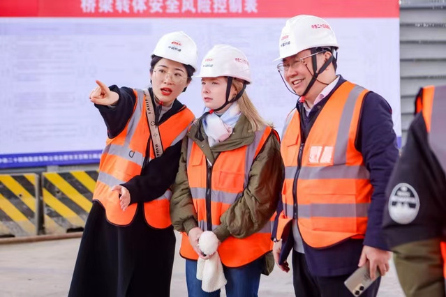 2023年11月15日上午,城市建設與交通學院教師丁蕾、城建學院國際交換生Eva Kapshina前往中鐵二十四局文忠路上跨合肥東站項目現場參觀國內首例非對稱變寬掛籃施工轉體橋轉體施工過程。