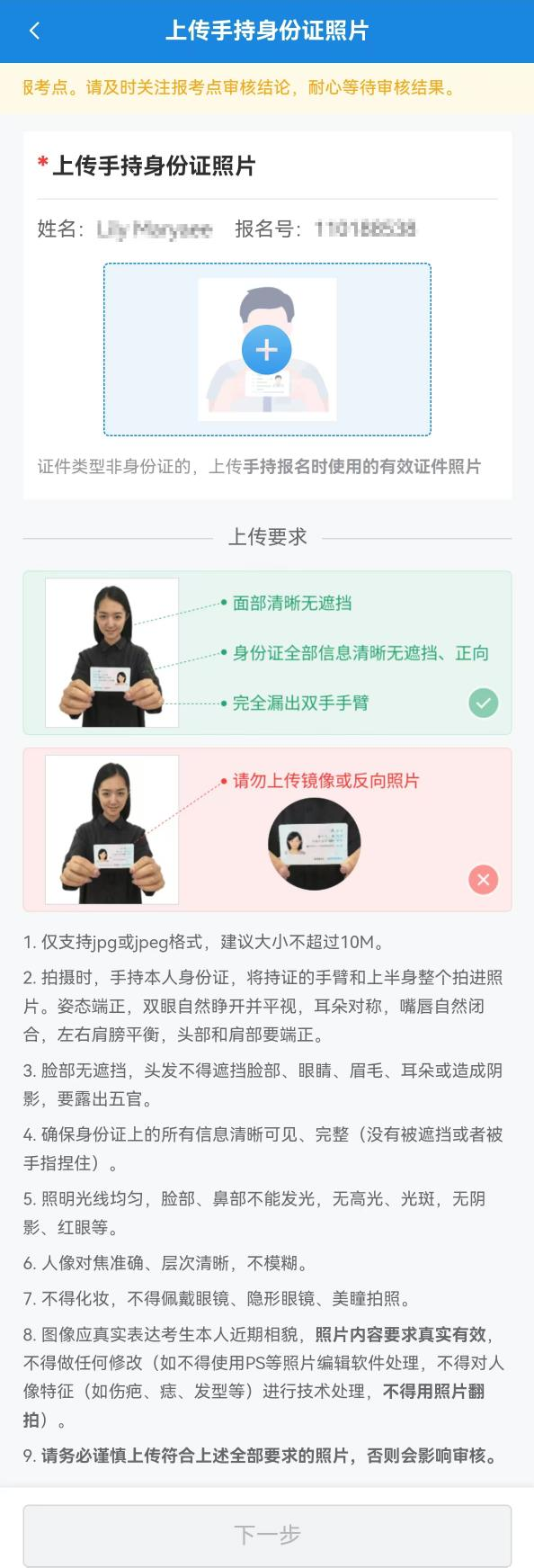 說明:如遇到身份證核驗未通過,考生必須提供身份證照片補充材料(有效居民身份證人像面、身份證國徽面;照片要求身份證邊框完整,字跡清晰可見,亮度均勻);如遇到報名時證件類型非居民身份證的,考生必須提供本人有效證件。(見附件)