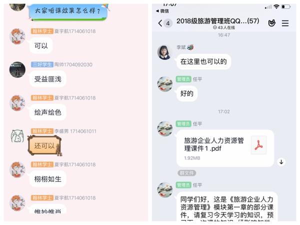 老師們紛紛表示,這么多天的準(zhǔn)備,收獲了滿滿的感動,克服重重困難與可愛的學(xué)生們網(wǎng)上相聚,同事們互相幫助攻克難關(guān),學(xué)校和學(xué)院不遺余力做我們的堅強后盾,自己將繼續(xù)努力,總結(jié)經(jīng)驗,以最飽滿的精神狀態(tài)上好每一堂課。同學(xué)們在朋友圈中寫道:人生第一次在線上課,感覺不錯。準(zhǔn)時出現(xiàn)在網(wǎng)上的虛擬教室里,仿佛就跟平時來到教室一樣,雖然沒有鈴聲,但心中有學(xué)校的召喚。