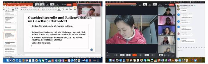 課堂上,我堅持不唱獨角戲、要做團體操的原則,積極開展線上互動,學生參與感強,課堂氛圍輕松融洽,并實時反饋和解答問題。《中級德語 2》平均每節(jié)課互動次數(shù)上百,我通過多層次輸入,從語言層面的詞句篇章的表達到內(nèi)容結(jié)構(gòu)與意義的講解,再到社會文化的背景結(jié)合與主題補充,提供相關音頻、視頻資源,充分調(diào)動學生課堂參與的積極性和語言產(chǎn)出的熱情,將問題和思考融入班級互動,依據(jù)課程難度,采取翻轉(zhuǎn)課堂的形式,組織班級結(jié)成學習小組,充分發(fā)揮學生的創(chuàng)造力和團隊合作能力。課后,利用騰訊會議,展開一周班會,收集學生線上學習效果反饋,及時備案與調(diào)整。