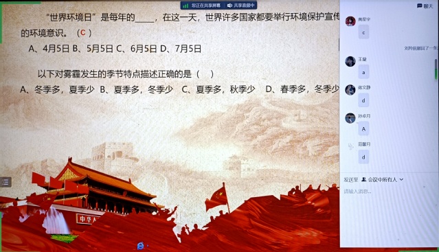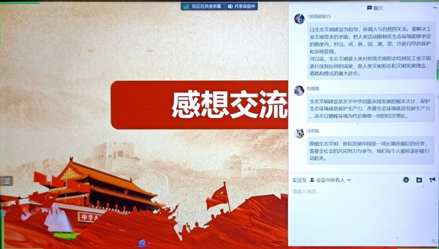 活動開始時,支部書記王多慈帶領支部黨員共同學習了習近平生態文明思想,以及安徽省第十一次代表大會會議精神。王老師指出,青年黨員應肩負起全面推進美麗中國建設、加快推進人與自然和諧共生的現代化的時代責任。接著,支部黨員在群聊中積極發表感想,通過相互交流學習到了如何更好地將生態文明建設付諸實踐,堅定自身推動生態文明建設的使命感和責任感。在活動的最后,支部黨員周天藝帶領大家進行了“生態知識我知道”的搶答小游戲,大家都踴躍參與其中,并表示這樣的趣味小游戲讓自己對于如何更好為生態文明建設貢獻青年力量有了進一步的幫助。