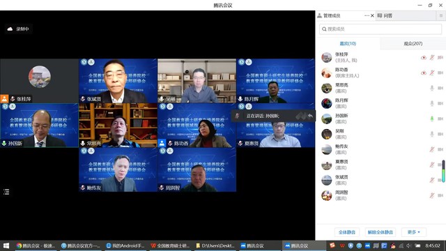 為貫徹落實全國及全省研究生培養(yǎng)和管理相關(guān)會議精神,建設(shè)高質(zhì)量的研究生導(dǎo)師和教育管理隊伍,10月30日,教育學(xué)院組織教育專業(yè)學(xué)位碩士生導(dǎo)師參加全國教育碩士研究生培養(yǎng)院校指導(dǎo)教師研修會(線上會議)。此次會議由中國學(xué)位與研究生教育學(xué)會主辦、濟(jì)南大學(xué)承辦,來自北京師范大學(xué)、華東師范大學(xué)、湖南師范大學(xué)、安徽師范大學(xué)、上海師范大學(xué)等全國80多所高校的近200位代表共聚云端,就教育碩士研究生培養(yǎng)和管理等議題進(jìn)行了熱烈而深入的研討。劉紅、謝兆樹、劉菂斐、衛(wèi)萍、陳芬萍、夏蓓潔、陳艷艷等12位研究生導(dǎo)師或管理人員通過視頻連線參加了此次會議。