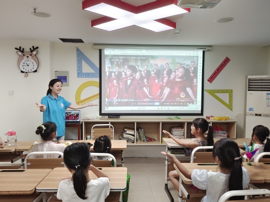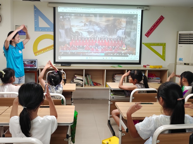 7月5日上午,合肥學院教育學院“七彩童年,‘育’你相伴”志愿團隊前往合肥市包河區濱湖和園社區開展“三下鄉”社會實踐活動。為讓同學們了解并學習手語,王玉、楊明月兩位志愿者為同學們帶來《國家》這首歌曲的手語舞蹈課。 學習手語是為了讓同學們更好地了解聾啞人這個特殊群體,帶領他們走近無聲的世界,從而在他們的心中播下善良友愛的種子。同學們高高舉起的小手滿載著她們對手語學習的渴望。在一片歡聲笑語中,同學們和志愿者一道踩著老師的節拍,手指在空中畫出完美的弧線,勾勒出愛的輪廓。當成龍演唱的《國家》音樂響起,同學們一個個坐得端端正正,視頻中歌曲與手語完美結合,同學們看得如癡如醉,并情不自禁地隨著視頻一起舞動起來。 手語是一種感情的溝通,心靈的釋放,為特殊人士與世界的交流架起一座心靈的橋梁,緊緊連接著彼岸的人們。志愿者望向同學們,面帶微笑地講,“小朋友們,什么是手語呀?”聽到老師的問題,一個小朋友快速地舉起了小手,“就是有些人聽不到講話,我們可以用手來表達給他,像這樣。”說著,他便舉起小手做了一個加油的動作。其他小朋友好奇地張望著,看來小朋友們都很感興趣。同學們全神貫注,目不轉睛地盯著老師的動作,生怕一個不留神就錯過了什么。當音樂響起,同學們馬上調整好狀態,臉上掛著甜甜的笑容,隨著音樂的節奏,小手在空中舞動,志愿者向他們豎起大拇指,課堂在熱烈的掌聲中落下了帷幕。