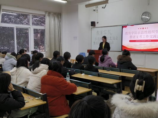 傳革命薪火,展青春舞姿。為了發揚共青團精神,展現青年之志,1219日下午4時,教育學院示范性組織生活會暨團支書工作交流會在三棟102教室順利舉行教育學院團委副書記張弦樂、團委學生會兼職副書記屠厚輝、團委學生會兼職副書記李艾錦、各班級團支書以及21級應用心理學班全體同學參會,組織部部長朱思宇擔任主持人。
