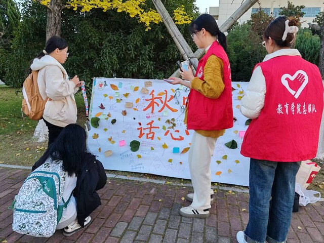 為了增強同學們的心理健康意識,幫助大家更好地應對生活中的困難和挑戰,11月20日至21日,教育學院陽光心理志愿服務隊在一期東門處舉辦了“落葉寄心語”活動。
