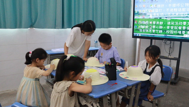 7月6日,合肥大學(xué)教育學(xué)院“同筑鄉(xiāng)村夢,共‘育’振興果”志愿服務(wù)隊(duì)在合肥市小廟鎮(zhèn)蜀山行知學(xué)校開展暑期“三下鄉(xiāng)”社會實(shí)踐活動。美育是審美教學(xué)與美感教學(xué)的結(jié)合,是新時代培養(yǎng)德智體美勞全面發(fā)展的社會主義建設(shè)者和接班人的重要著力點(diǎn),其中藝術(shù)是美育最集中最典型的形態(tài)。本次課程,教師魯?shù)つ菀悦烙鳛榍腥朦c(diǎn)給小朋友們帶來了一節(jié)妙趣橫生的草帽繪制藝術(shù)。