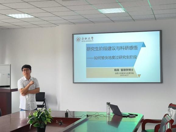 2025年4月27日下午16:00,由合肥大學研究生處、科研處主辦,旅游與會展學院承辦的研究生學術沙龍系列講座于合肥大學一期2棟226會議室順利開展。旅游與會展學院專任教師楊森博士以“研究生階段建議與科研感悟——如何愉快地度過研究生階段”為主題進行分享交流。