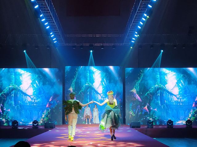 在主持人介紹完應邀出席嘉賓后,綠模大賽正式拉開帷幕。生物食品與環境作為第四支出場的隊伍,在綠色森林的帷幕下,模特們化身為一群活潑的精靈,伴隨著靈動的音樂去探索森林的奧秘,給觀眾帶來了一場視覺盛宴。設計師們將服裝設計與綠色環保理念、慶祝建黨100周年的紅色元素相融合,使服裝擁有了獨特的活力。其中1號精靈手持綠色魔法權杖,肩負著黨徽,邁著自信的步伐向我們走來,令我們更加堅定我們在努力投身于中國特色社會主義建設時同樣要重視環保建設。比賽結束,生物食品與環境學院獲得了本次比賽第六名。