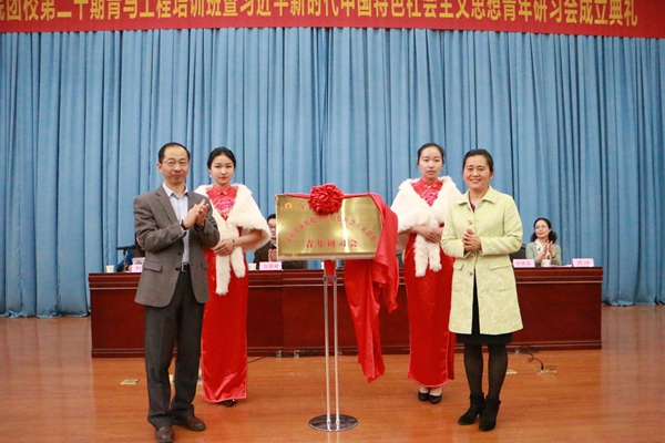 團委學生會管理辦公室副主任丁婧老師宣讀《關于舉辦合肥學院團校第二十期青年馬克思主義者培養工程2017級大學生新生骨干培訓班的通知》,宣讀習近平新時代中國特色社會主義思想青年研習會章程。第二十期青馬班學員代表孫方宇進行發言,他表達了青年們對馬克思主義精神、習近平新時代中國特色社會主義思想的認識。隨后,洪家友和胡艷萍共同為習近平新時代中國特色社會主義思想青年研習會進行揭牌和授旗儀式。洪家友還為青年研習會指導老師蘇冰頒發聘書,并作重要講話,他為青年馬克思主義工程的后期建設提出建議,表達了對新生骨干們學習的期望和祝福,希望同學們能在習近平新時代中國特色社會主義思想和精神的指導下深入學習,心懷祖國,志存高遠,成為祖國建設的有用之才,為中國夢奉獻一份力量。最后,胡艷萍作第一次授課。