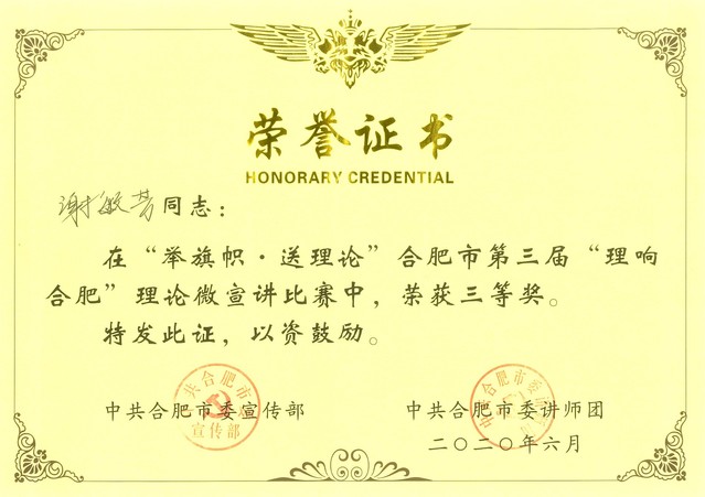| 謝敏芳參加合肥市第三屆理論微宣講比賽獲三等獎 |