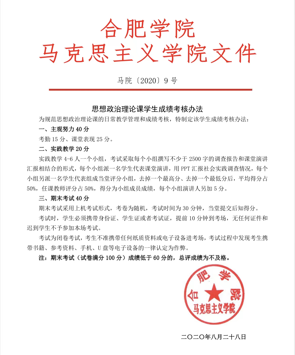 思想政治理論課學(xué)生成績考核辦法(馬院〔2020〕9號)