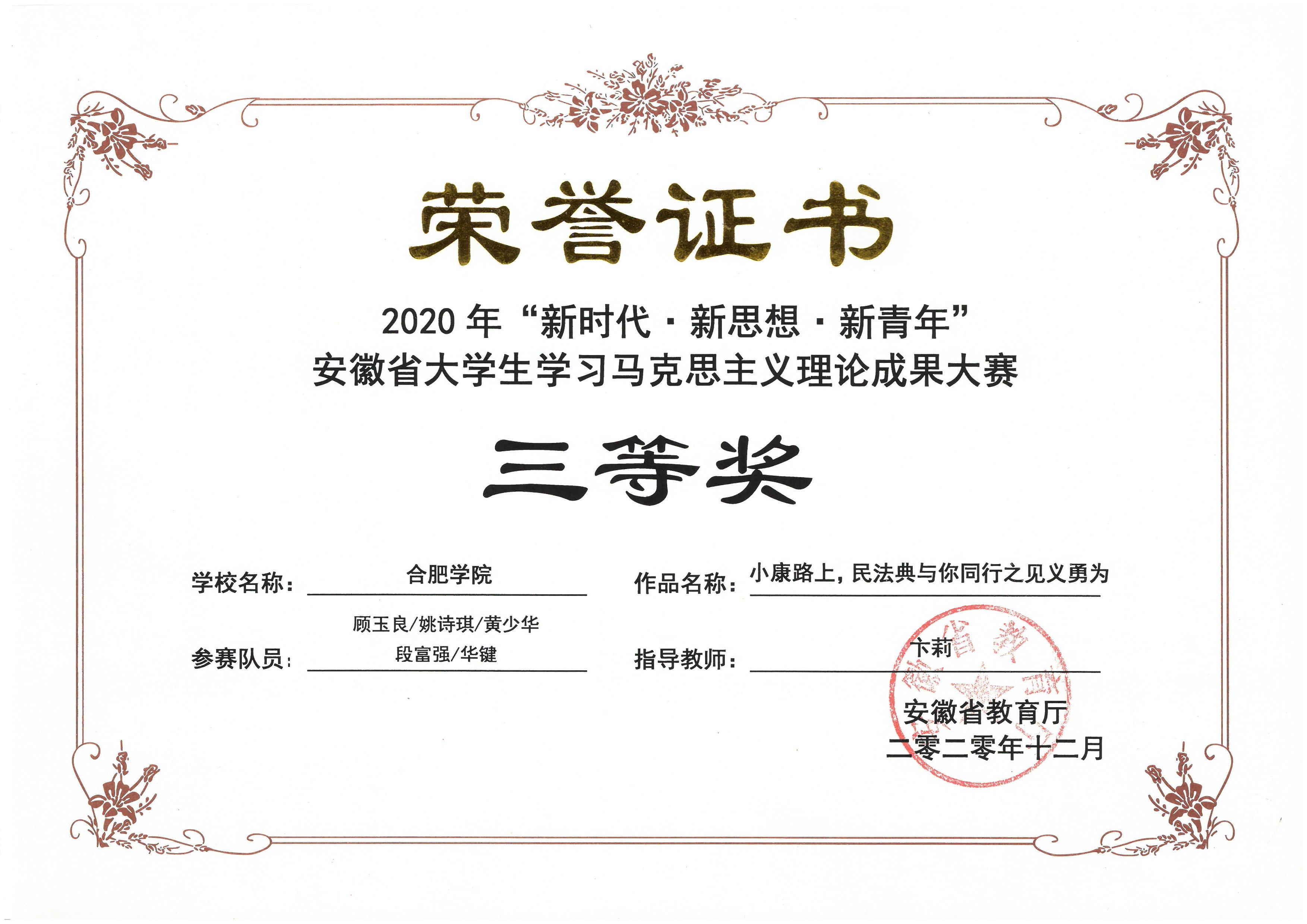 2020合肥學院-顧玉良、姚詩琪、黃少華、段富強、華鍵-微創作《小康路上,民法典與你同行之見義勇為》省級三等獎