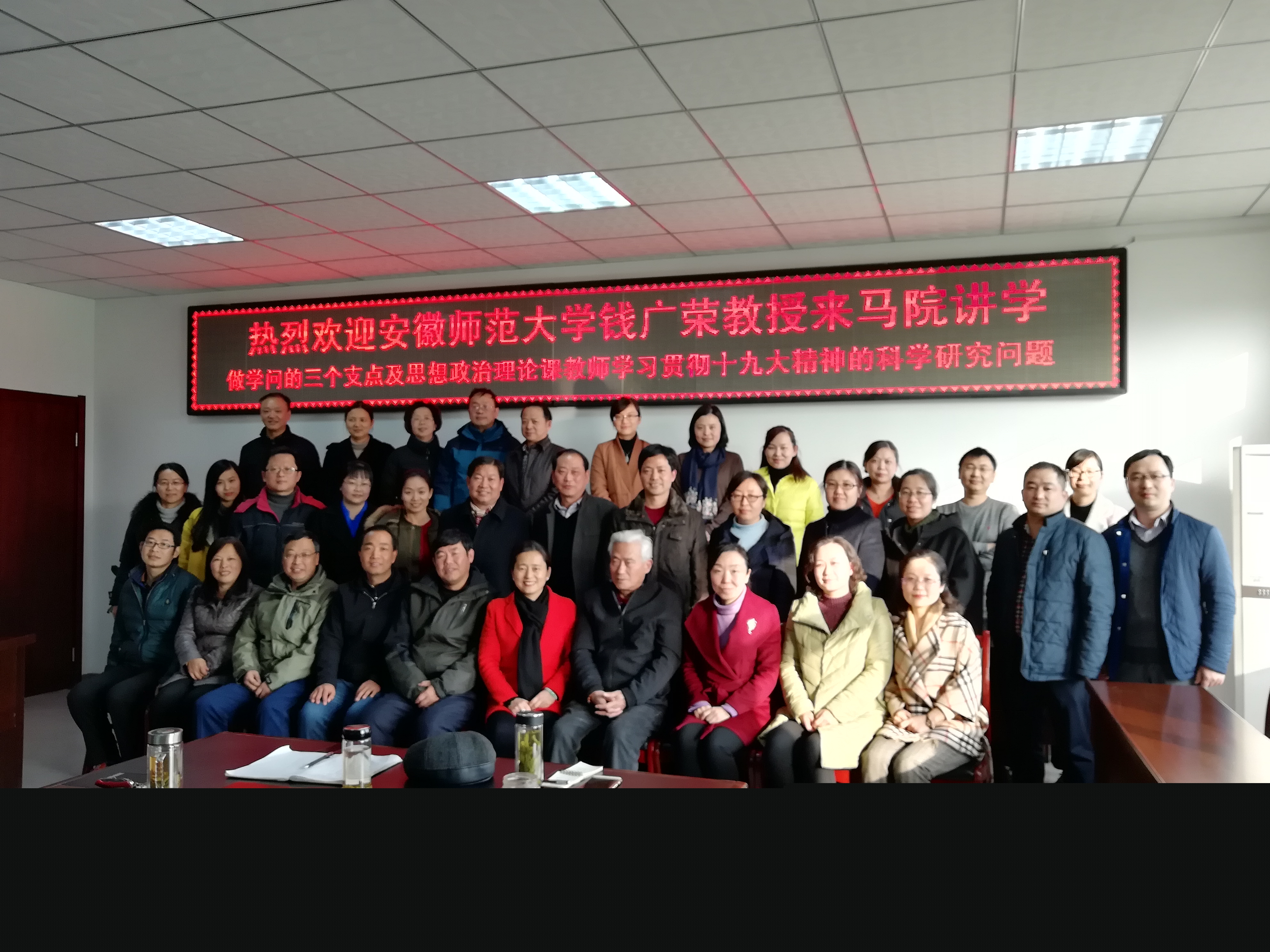 2017年12月6日下午,安徽師范大學錢廣榮教授應邀到合肥學院馬克思主義學院講學,錢教授以《做學問的三個支點和思想政治理論課教師學習貫徹十九大精神的科學研究問題》為題作學術報告。馬克思主義學院胡艷萍院長主持,全體思政課專兼任教師到場聆聽,報告在馬克思主義學院會議室舉行。