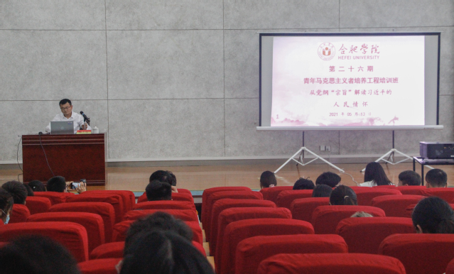 為深入貫徹落實習近平總書記關于學習“四史”的指示精神,增強我校學子全心全意為人民服務的意識,合肥學院于2021年5月13日在圖書館報告廳B廳舉行了合肥學院團校第二十六期青年馬克思主義者培訓工程學生組織骨干培訓第七次授課。此次培訓由先進制造工程學院團委老師梅志強做題為“從黨綱‘宗旨’解讀習近平的人民情懷”的專題報告。