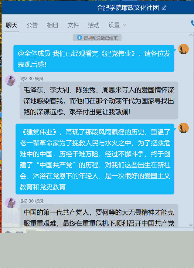 此次團日活動主要以主題會議的形式展開。當天晚上七點,參與活動的同學們早已提前進入QQ群語音。會議伊始,社團團支書李致遠發言,向大家介紹此次團日活動的主要內容和開展的重要性。隨后便是集體觀看電影《建黨偉業》精選片段,通過觀看電影,感受了革命先輩崇高的信仰,進一步加深了社員們對黨的歷史和黨的路線、方針、政策的認識,同時也營造出濃厚的愛國主義教育與氛圍,激發了社員們學習和發揚革命先輩艱苦奮斗、無私奉獻的革命精神。緊接著,團支書帶動大家一起發表觀后感,并討論自己對百年黨史的學習感悟,同學們紛紛被打動,更加踴躍發言。最后,團支書和社長發言,就此次活動做了簡單總結,激勵社團成員對百年黨史進行持續深入學習,不忘初心。