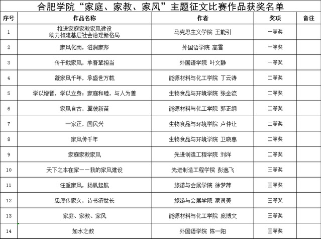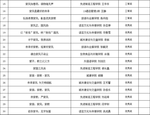 經(jīng)過二級學院和各部門廣泛動員、宣傳,我校師生踴躍報名,共收到征文30篇,他們圍繞主題,立足家庭,貼近實際,放眼社會,以文字生動詮釋了中華民族傳統(tǒng)家庭美德。經(jīng)校外專家評比打分,評一二三等獎和優(yōu)秀獎若干,其中,馬克思主義學院王能引等3人獲一等獎能源材料與化工學院丁云濤等6人獲二等獎,先進制造工程學院彭逸飛等8人獲三等獎。