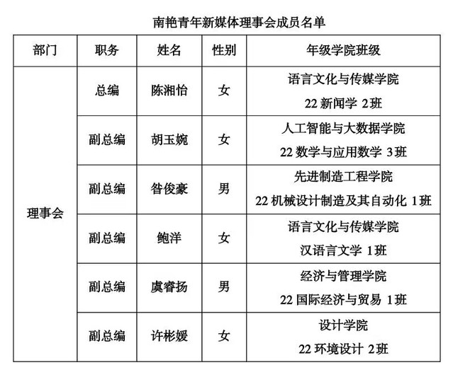 南艷青年新媒體中心設(shè)理事會(huì),理事會(huì)下設(shè)辦公室、信息部、數(shù)字部、新聞部、視媒部、設(shè)計(jì)部六個(gè)部門(mén)。理事會(huì)設(shè)總編、副總編,各部門(mén)設(shè)分管總編、主編、編輯、實(shí)習(xí)小編。
