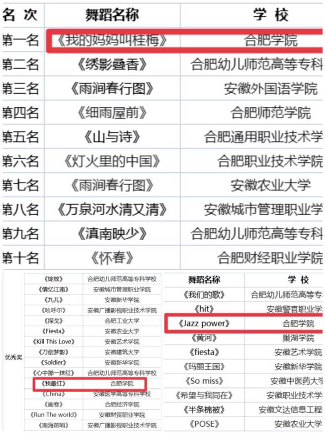 合肥大學生文化藝術季校園比賽每年舉辦一次,為在肥高校和大學生提供了展示文化建設成果的大舞臺。2021年活動主題為“百年恰風華·奮斗正青春”,包括合肥大學生校園舞蹈大賽、合肥大學生校園演講大賽及合肥大學生校園歌手大賽三大類。其中,我校報送的舞蹈作品《我的媽媽叫桂梅》獲中國舞組第一名,《Jazz power》獲現代舞組第三名,《我最紅》獲現代舞組優秀獎;徐萌萌獲演講大賽第七名,周思慧、肖博文、王雪燕獲優秀獎;徐思揚獲校園歌手大賽優秀獎。