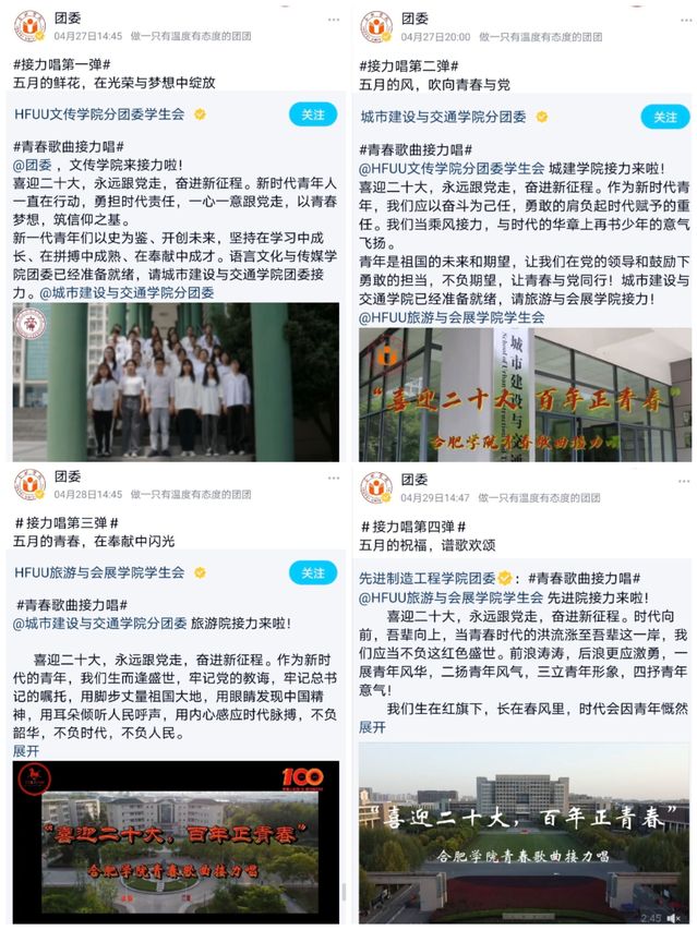 為了號召青年永遠跟黨走、弘揚五四精神、激發青春活力、展現青春風采,我校組織開展了“青春歌曲接力唱”活動,校團委和11個二級學院團委聯動,以接力的形式傳唱紅色歌曲,表達愛國愛黨情感?!冻礁杞o黨聽》《光榮啊!中國共青團》《在燦爛的陽光下》這些經典紅色歌曲,在傳唱中歷久彌新。