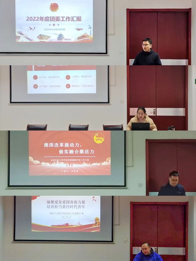 11個學院團委負責人現場述職,結合年度重點任務和工作目標,圍繞引領力、組織力、服務力和貢獻度四個方面展開匯報,總結成績、凝練品牌、反思不足,交流了今后的工作思路和改進措施。各學院團委堅持從嚴治團和深化改革,2022年度工作特點鮮明。人工智能與大數據學院通過舉辦“萌新杯”、大數據與人工智能應用、數獨深度游等科技競賽以賽促學,以賽提能;外國語院發揮多語言教學優勢,開展外語類話劇、演講、誦讀大賽激發大學生學習熱情;能源材料與化工學院聚焦學院黨建帶頭和共青團優勢,堅持黨團共建服務學生;經濟與管理學院持續夯實基層支部建設,選樹優秀典型,發揮榜樣引領作用;教育學院積極打造電子課件設計大賽、特色短劇等師范生品牌活動;城市建設與交通學院緊扣“做青年學生的貼心人”為師生辦實事,提升共青團服務力;生物食品與環境學院統籌學科、社團資源,搭建創新創業聯動平臺;語言文化與傳媒學院以“紅色經典誦讀大會”等主題教育活動為載體,凝聚青年理想信念;先進制造工程學院著力打造網絡媒體平臺,宣傳教育工作提質提量,社會實踐成效顯著,暑期“三下鄉”實踐活動受到合肥晚報、安徽衛視等媒體報道;旅游與會展學院不斷提升實踐育人成效,協助安徽省腫瘤防治所開展三個“防癌”主題系列活動;設計學院為山區設計農產品包裝和文化導覽圖,將專業特長與助農助民結合,助力鄉村振興。