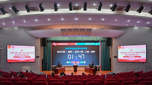 近日,省發展改革委、省教育廳舉辦安徽省第二屆大學生誠信辯論賽暨誠信進校園活動。4月8日下午,合肥學院校辯論賽決賽在圖書館A廳順利舉行,邀請2020年第三屆世界中醫藥學會聯合會中醫藥主題辯論賽總決賽季軍管祝、2021年第十一屆安徽辯論聯賽個人賽亞軍楊耀文、第一屆安錦賽亞軍2021年華語辯論世界杯合肥賽區冠軍邢松賀三位擔任評委。