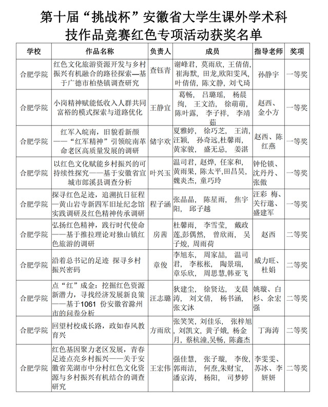 近日,由共青團(tuán)安徽省委員會、安徽省教育廳、安徽省科學(xué)技術(shù)協(xié)會、安徽省社會科學(xué)院、安徽省學(xué)生聯(lián)合會等單位共同主辦的第十屆“挑戰(zhàn)杯”安徽省大學(xué)生課外學(xué)術(shù)科技作品競賽紅色專項(xiàng)活動(dòng)結(jié)果揭曉。我校學(xué)生作品榮獲省賽一等獎(jiǎng)5項(xiàng),二等獎(jiǎng)5項(xiàng)。