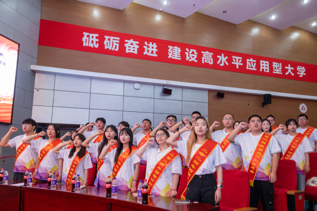 出席會議的領導依次為全國重點團隊、全國專項及省級專項團隊、校級重點團隊學生代表進行授旗,校領導為28名西部計劃志愿者頒發紀念品。志愿者們集體宣誓,聲聲誓言承載著志愿者們的初心與使命。