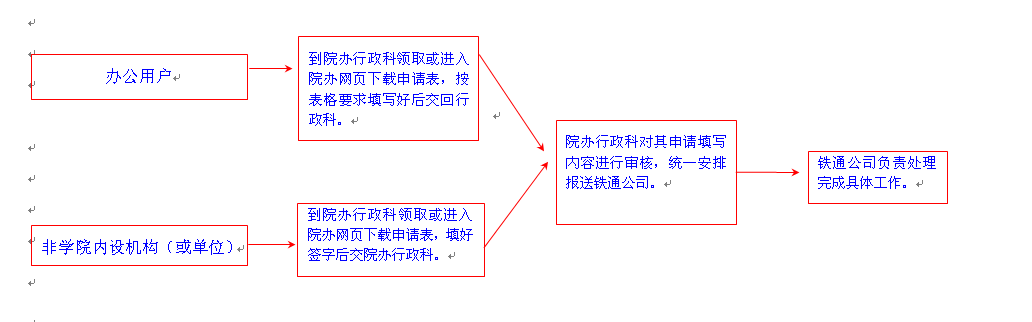 申請安裝辦公電話的用戶,需經本部門(或本單位)負責人同意,由經辦人到校辦行政科領取或進入校辦網頁下載《合肥大學固定電話登記表》表格、填寫相關電話業務登記表格,并加蓋部門公章后,送回校辦行政科,由行政科對其填報內容進行審核,符合裝機、移機等相關業務條件,再按學校統一配號原則予以配號后統一報至鐵通公司,由該公司按所報內容要求安排處理。