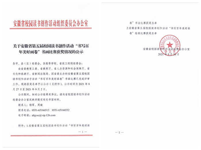 近日,中共安徽省委教育工委關于慶祝建黨100周年系列活動——書寫百年美好畫卷師生書畫作品征集暨安徽省第五屆校園讀書創作活動“書寫百年美好畫卷”書畫比賽獲獎情況公示,我校報送的6件作品全部獲獎,其中二等獎2件,三等獎4件。