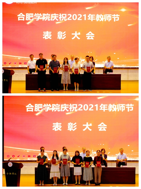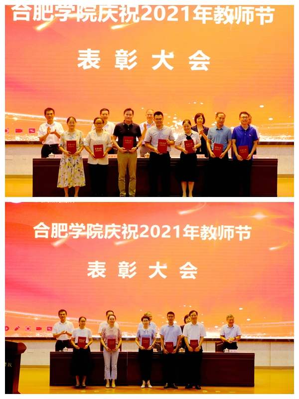 校領導為合肥學院首屆“我最喜愛的教師”獲獎人員、首屆“教學創新大賽”獲獎代表、第十一屆青年教師教學(創新)競賽獲獎教師代表、2019-2020年“三育人”和“師德建設”先進個人代表、“光榮從教30年”代表、2020年全省大中專學生志愿者暑期“三下鄉”社會實踐活動“優秀個人”獲獎代表、“安徽省高校餐飲系統疫情防控工作先進集體”獲獎單位、“安徽省脫貧攻堅先進個人”獲獎代表、第九屆“挑戰杯”安徽省大學生課外學術科技作品競賽指導教師獲獎代表、2020年安徽省質量工程獲獎代表、安徽省教科文衛體系統“師德先進個人”獲獎人員、安徽省科學技術獎獲獎代表、吉林省科學技術獎獲獎人員、廣西壯族自治區科學技術獎獲獎代表、第十二屆“挑戰杯”全國大學生創業計劃競賽指導教師獲獎代表、安徽省“教書育人楷模”等60余名教師頒獎。