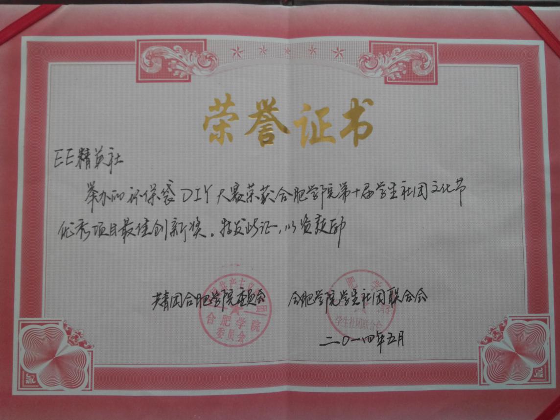 5月29日,合肥學院第十屆學生社團文化節頒獎典禮圓滿落幕,EE精英社舉辦的環保袋DIY涂鴉大賽活動榮獲社團文化節優秀項目最佳創新獎。