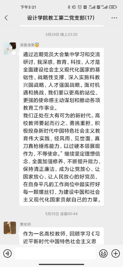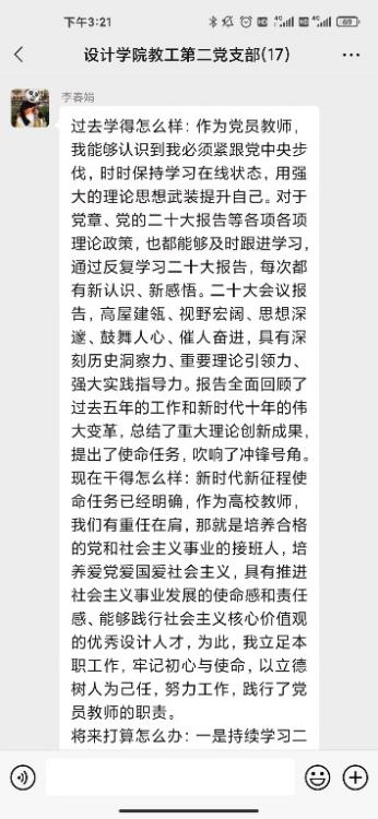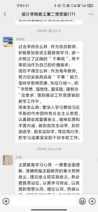 研討會第二環(huán)節(jié)支部黨員針對合實際圍繞“三問”(過去學得怎么樣、現在干得怎么樣、將來打算怎么辦)展開了線上交流研討。黨員教師在支部微信群積極展開研討,深入剖析過去、現在、未來的工作和學習。