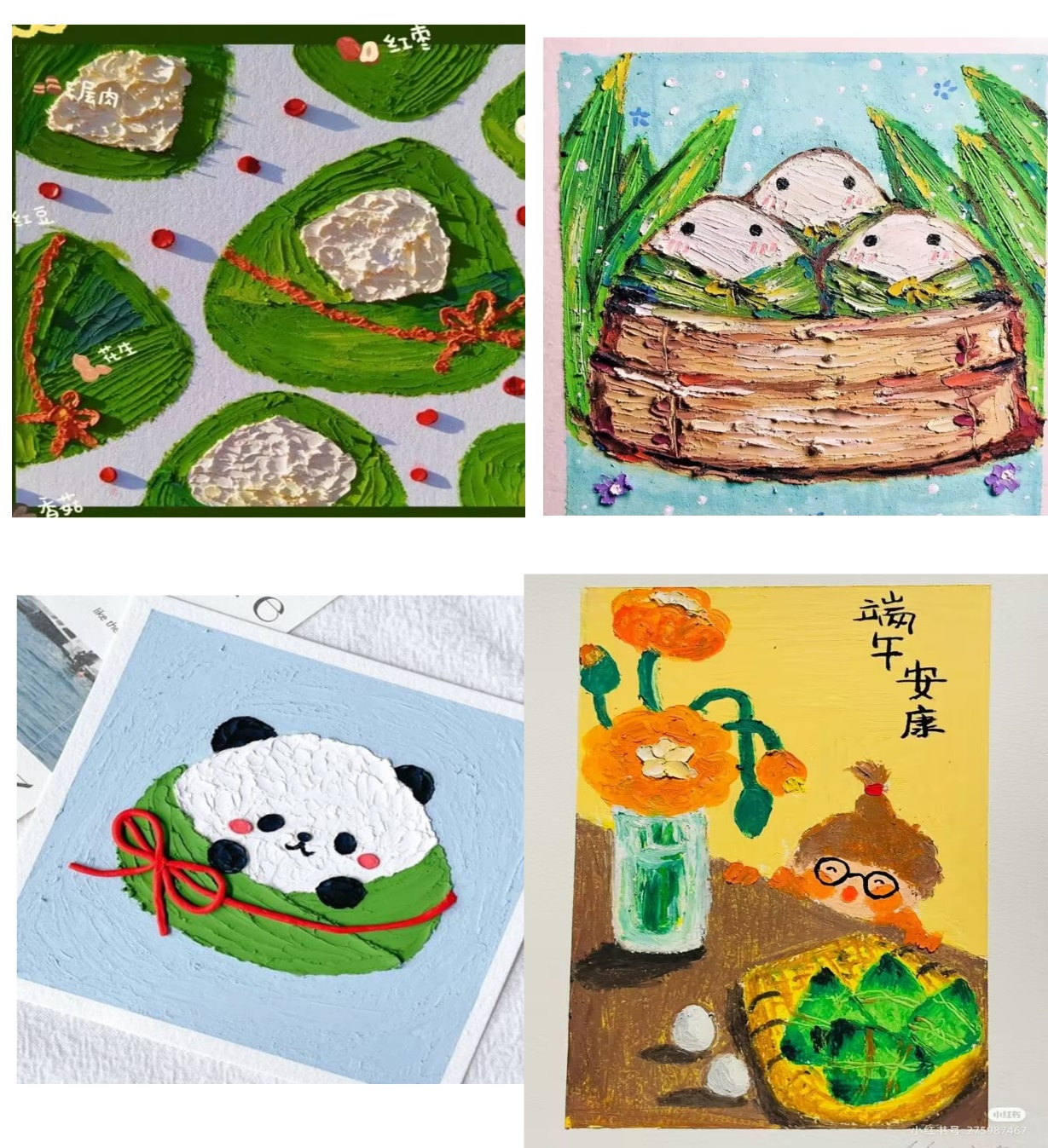 環節二繪畫端午主題創意卡片。學生黨員給每位參與者發放空白賀卡、彩鉛、油畫棒、膠帶等材料,由參與者提出繪畫的主題,各黨員教師和學生充分發揮自身專業優勢,一對一指導參與者繪畫卡片。大家畫的粽子各種各樣,形態各異,活動現場其樂融融。