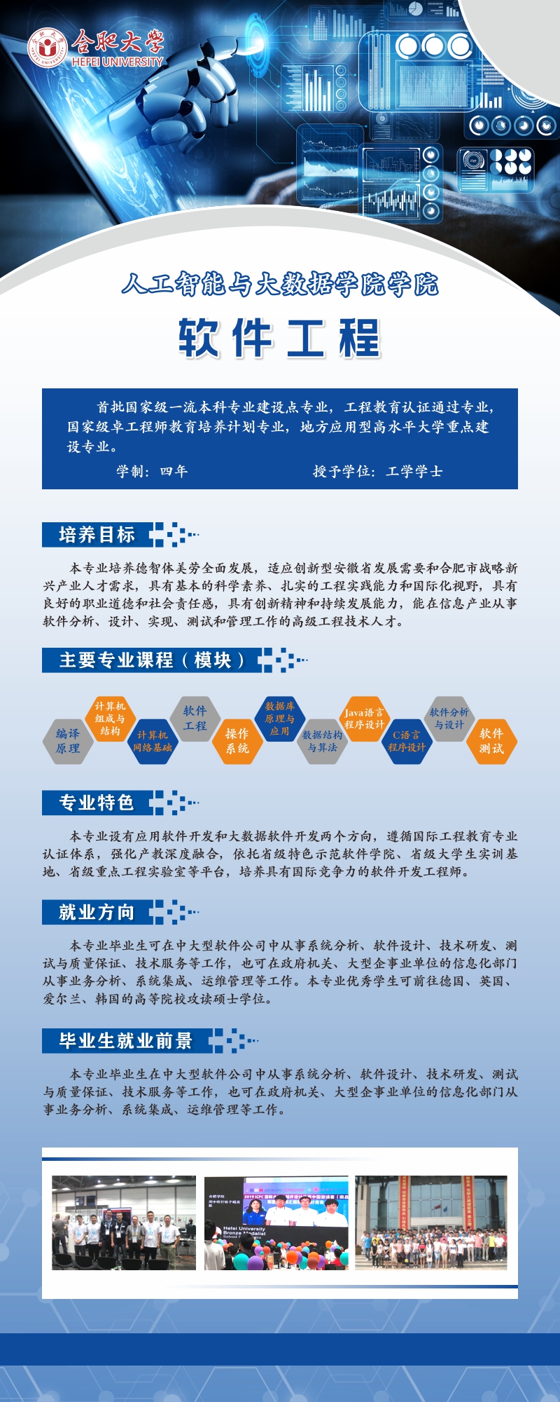 畢業(yè)生發(fā)展方向:畢業(yè)生可在中大型軟件公司中從事系統(tǒng)分析、軟件設(shè)計、技術(shù)研發(fā)、測試與質(zhì)量保證、技術(shù)服務(wù)及項目管理等工作;也可在政府機關(guān)、企事業(yè)單位的信息化部門從事業(yè)務(wù)分析、系統(tǒng)集成、運維管理等工作;也可繼續(xù)攻讀碩士學(xué)位研究生或出國深造。